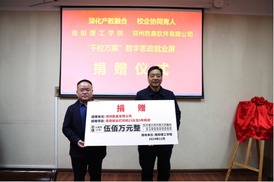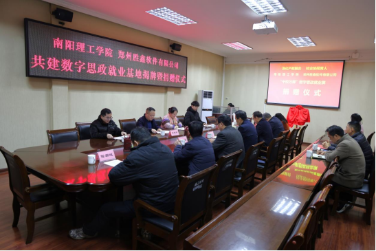 本网讯(记者/鲁静薇 通讯员/韩芳)12月30日上午,我校在第一会议室举行南阳理工学院郑州胜鑫软件有限公司共建数字思政就业基地揭牌暨捐赠仪式。