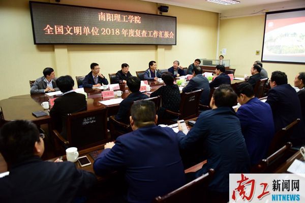 邢勇以《不忘初心、牢记使命、立德树人,谱写新时代南阳理工学院精神文明建设更加出彩新篇章》为题,汇报了学校2018年度精神文明建设工作的开展情况、成效和体会。他说,近一年来,学校精神文明建设工作坚持以习近平新时代中国特色社会主义思想和党的十九大精神为指导,以培育和践行社会主义核心价值观为根本,坚持立德树人,广泛开展精神文明创建活动,为全面提高学校人才培养水平、加快建成特色鲜明的高水平应用型理工大学提供了有力思想保证和精神动力。他表示,学校将以此次检查为契机,总结成绩,寻找差距,进一步深化创建、改进创建,不忘初心,牢记使命,立德树人,以习近平新时代中国特色社会主义思想和党的十九大精神为指导,认真学习贯彻全国宣传思想工作会议和全国教育大会精神,全面贯彻落实全国、全省高校思想政治工作会议精神,扎实做好精神文明建设各项工作,为建成特色鲜明的高水平应用型理工大学提供坚强思想保证、强大精神动力、丰润道德滋养、良好文化条件,为谱写新时代南阳理工学院更加出彩新篇章做出新的更大的贡献。