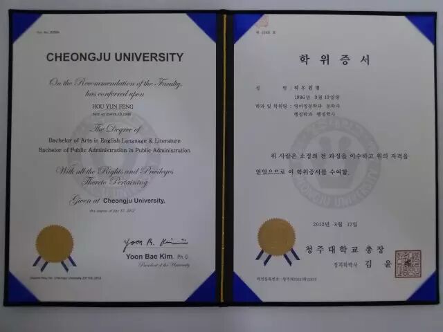 3、取得韩国清州大学的硕士研究生、博士研究生学历学位。