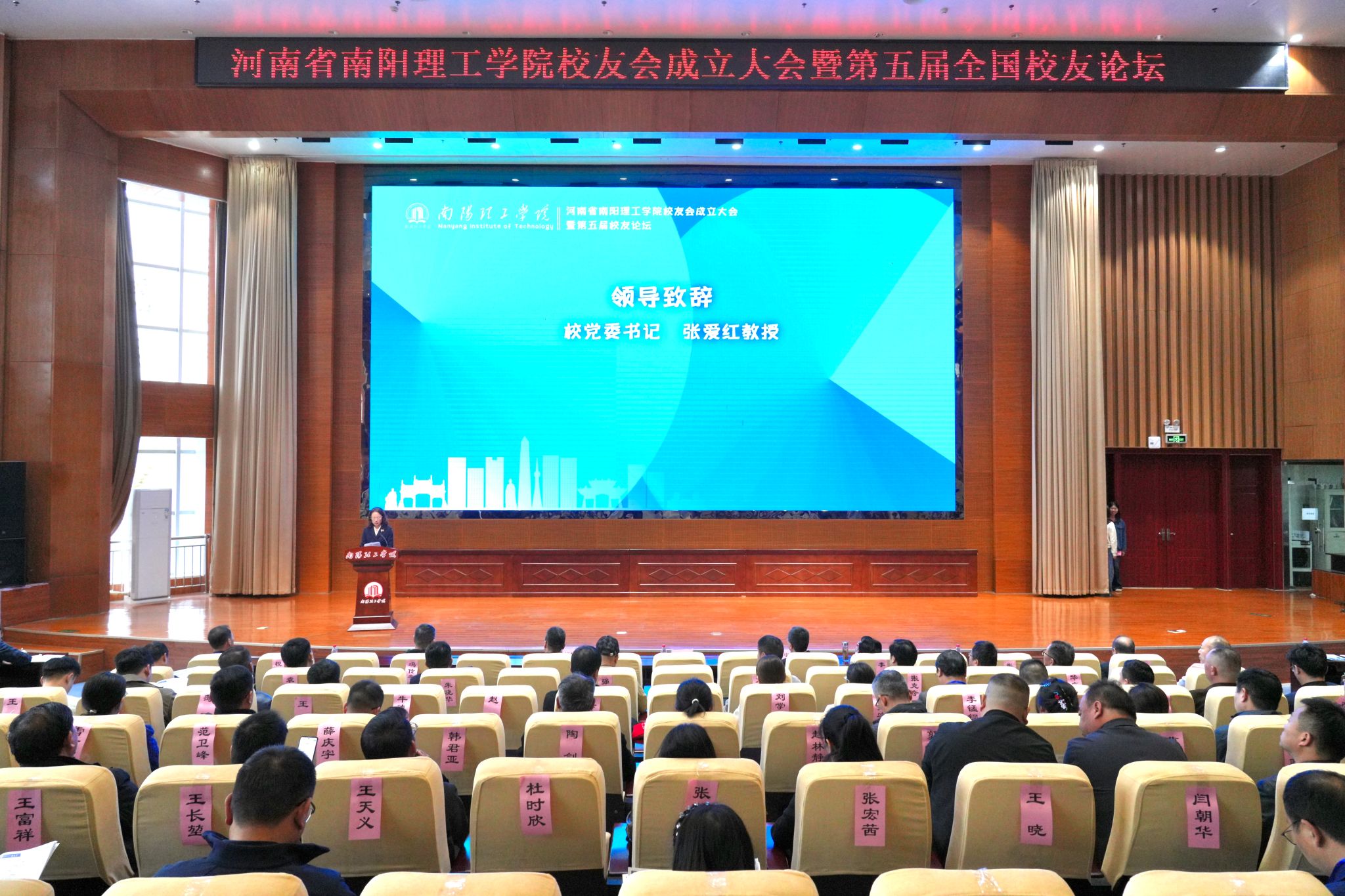 本网讯(特约记者/鲁静薇 学生记者/胡秋阳)春景渐芳,暄和未尽。3月28日,南阳理工学院校友会成立大会暨第五届全国校友论坛在南阳理工学院第三报告厅举行。来自全国各地的校友代表齐聚一堂,共同见证南阳理工学院校友会正式揭牌成立的历史性时刻。校党委书记张爱红、校长郝好山,校党委副书记、工会主席董豪,副校长蔡广宇、高芳放、黄金书、吴战勇出席大会,校友会会员、各地校友会代表、特邀校友代表及学校相关部门负责人参加大会。