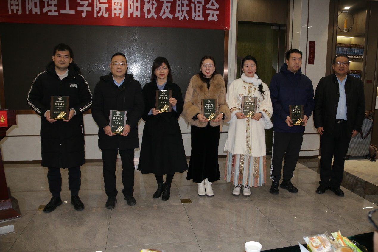 现场对表现突出的优秀校友予以表彰,南阳理工学院副校长葛晨光教授为校友南阳市远航商贸有限公司梅振波、南阳印象眸珠宝股份有限公司杨志强、河南明铂尔®不锈钢有限公司高明、沙洋县公安局李正、